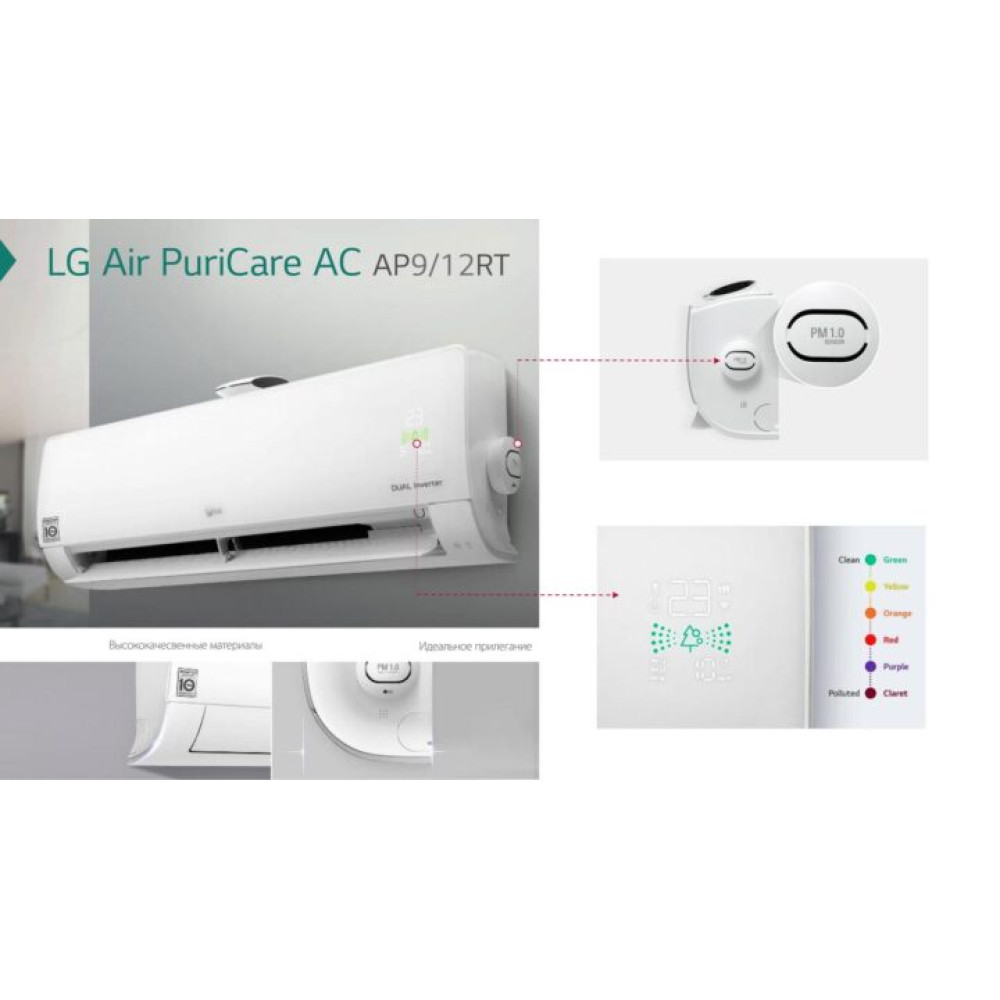 Чотирьох -кольоровий Смарт-дисплей. Датчик забруднення PM 1.0 забезпечує виявлення надмілкого пилу в режимі реального часу і інтуїтивно відображає стан повітря, використовуючи чотири кольори. Сучасний інверторний компресор LG вирішує проблеми, пов’язані з недостатньою продуктивністю і шумом, в результаті чого кондиціонер охолоджує приміщення швидше, працює тихіше і служить довше. Компресор з широким діапазоном частоти обертання економить електроенергію і швидше охолоджує повітря. Вишуканий і сучасний дизайн органічно впишеться в будь-який інтер’єр.