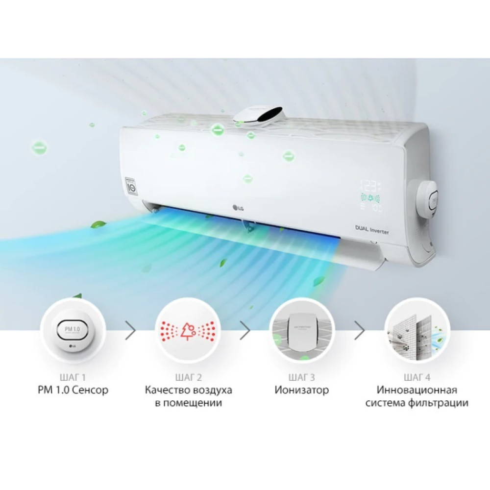 Кондиціонер LG оснащений системою очищення 2-в-1 (комфортне охолодження і фільтрація повітря), яка захистить вас від дрібного пилу, мікроорганізмів, бактерій і над мілких частинок розміром PM 1.0.