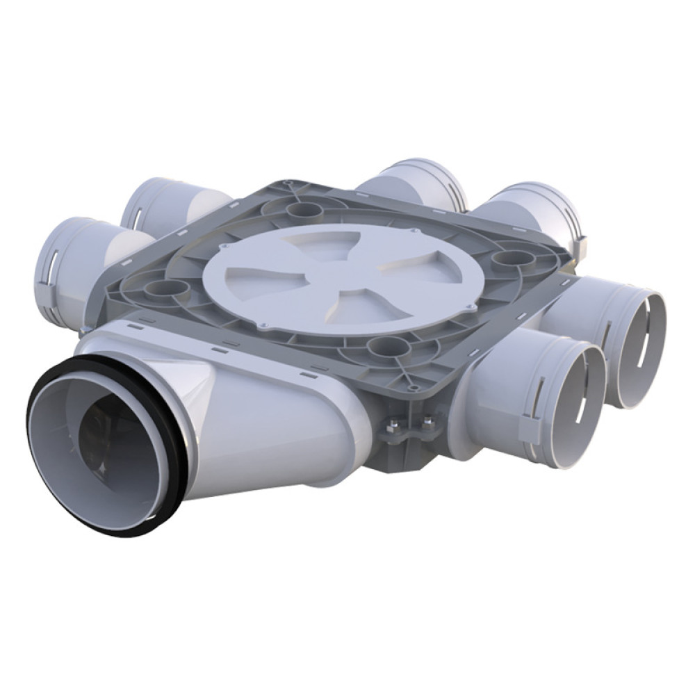 Колектор Вентс ФлексіВент 1051125/90x6 використовується для підключення шести повітроводів ∅ 90 мм до виходу від вентилятора або вентиляційної установки ∅ 125 мм.
