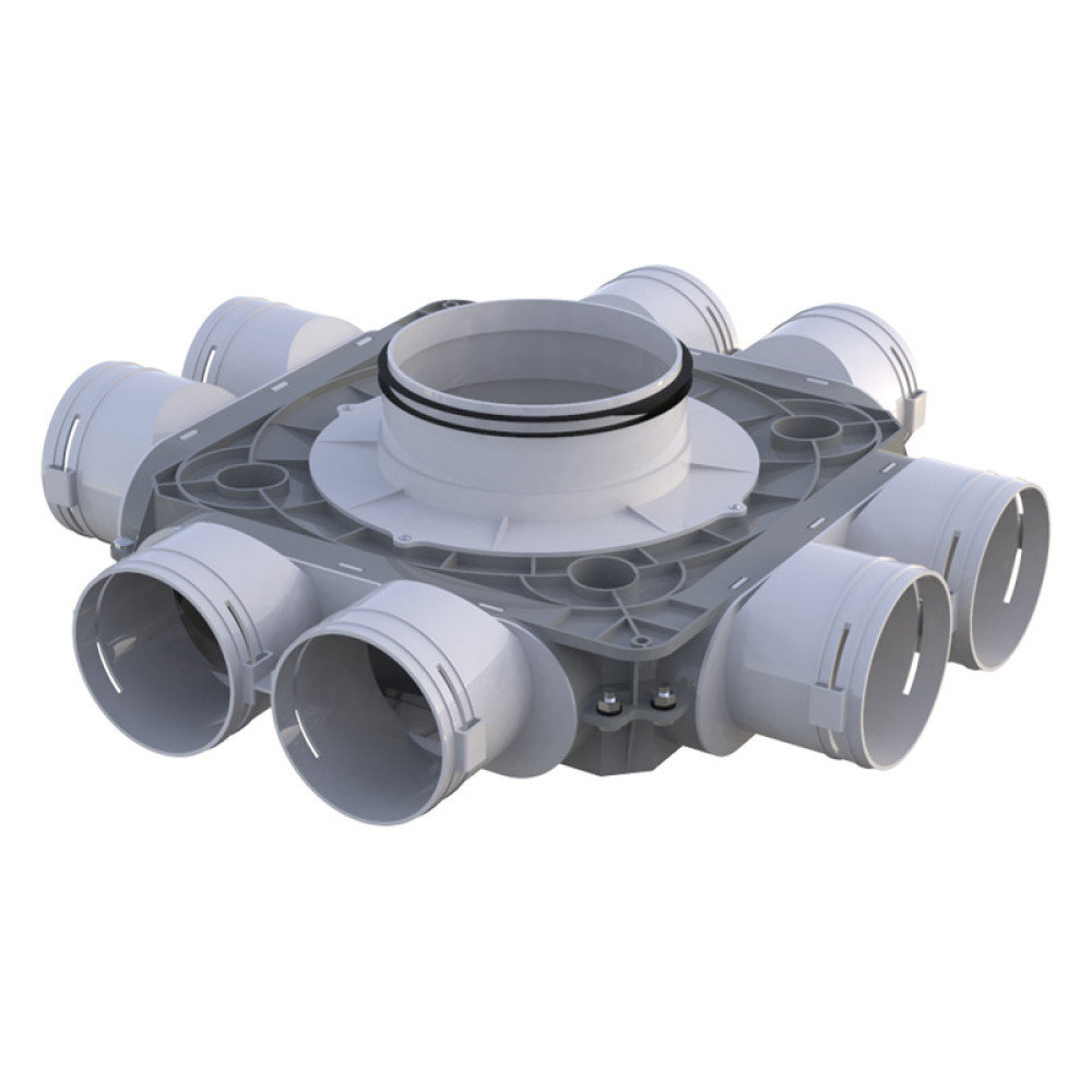 Колектор Вентс ФлексіВент 1050160/90x8 використовується для підключення восьми повітроводів ∅ 90 мм до виходу від вентилятора або вентиляційної установки ∅ 160 мм.