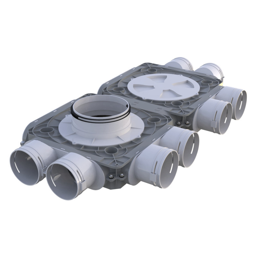 Колектор Вентс ФлексіВент 1051200/90x8 використовується для підключення восьми повітроводів ∅ 90 мм до виходу від вентилятора або вентиляційної установки ∅ 200 мм.