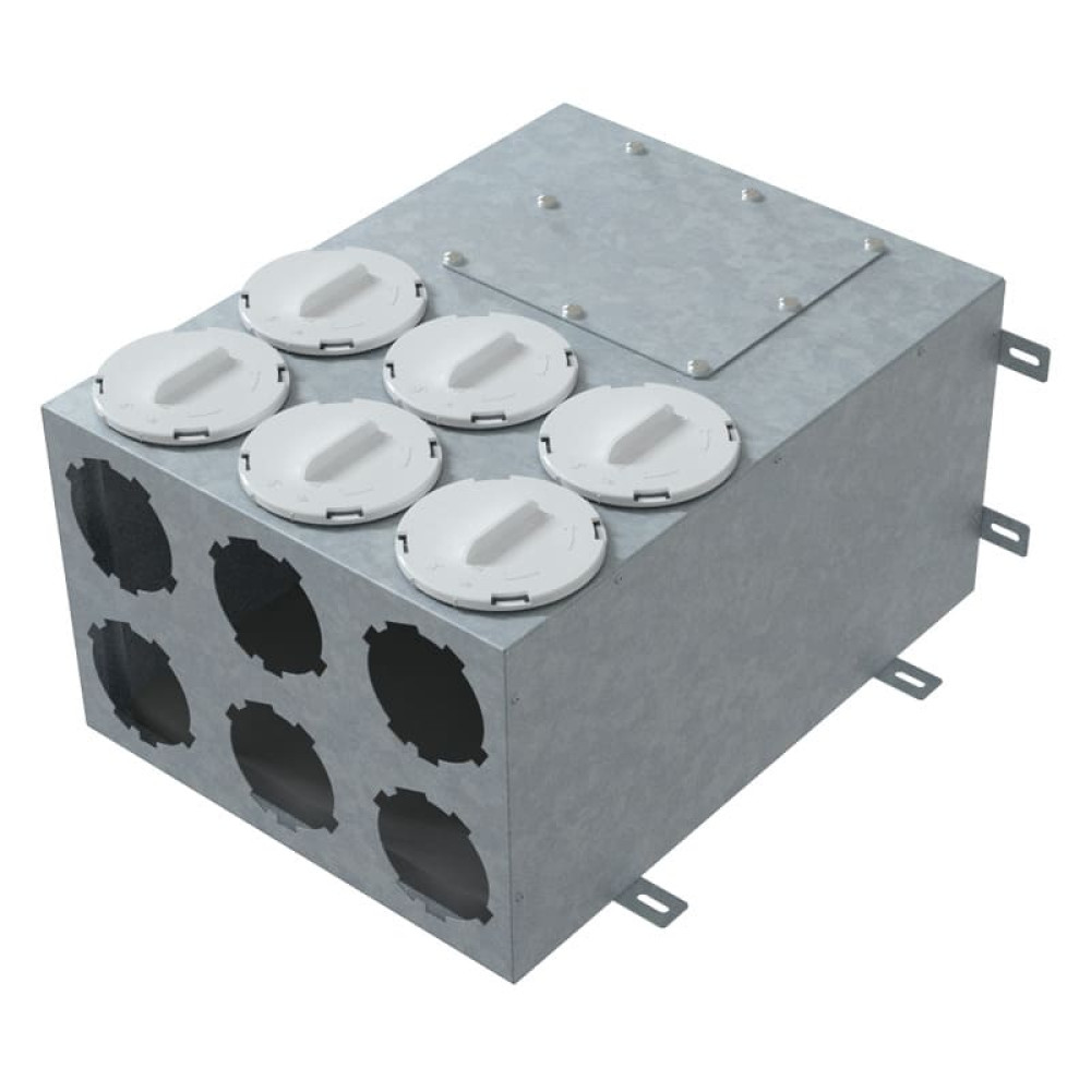 Для розподілу повітря по каналах необхідно використовувати фланці, які вставляються в отвори колектора. Канали кріпляться до колектора за допомогою замку на фланці. Якщо деякі отвори в колекторі не використовуватимуться, то їх перекривають заглушками з ущільнювачем(купується окремо).