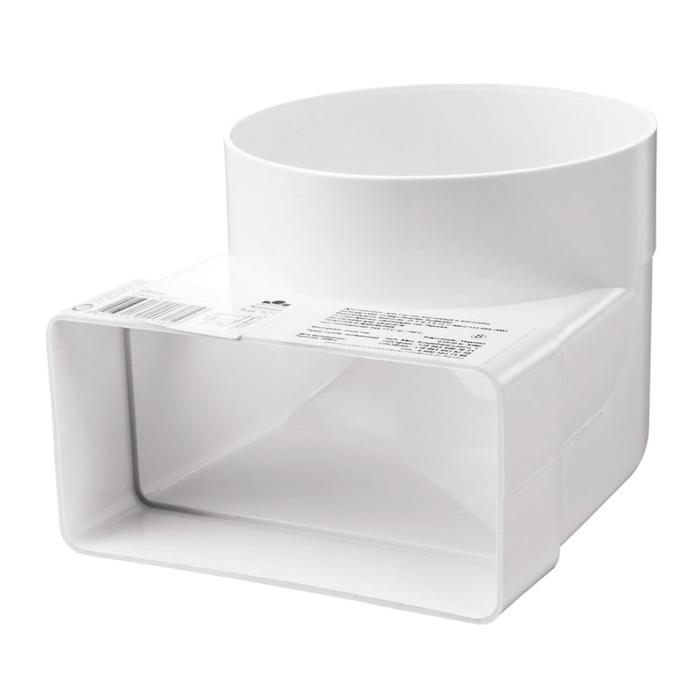 Коліно для плоского та круглого повітроводу пластикове Вентс 922 з'єднує повітропровід пластиковий 90х220 мм з круглою трубою 125 мм під кутом 90°. Цей виріб є одним з елементів вентиляційних труб для витяжки кухні, ванної або туалету квартири, приватного будинку чи комерційного приміщення. Також застосовується для припливної вентиляції.