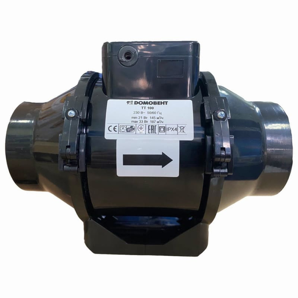 Канальний вентилятор Домовент ТТ 100 є круглим вентилятором в пластиковому корпусі. Вентилятор може переміщати повітря в системах вентиляції з максимальною продуктивністю 187 м3/год. Обладнаний однофазним двошвидкісним електродвигуном зі вбудованим тепловим захистом. Підключається до повітропроводів або інших елементів системи вентиляції з діаметром 100 мм.