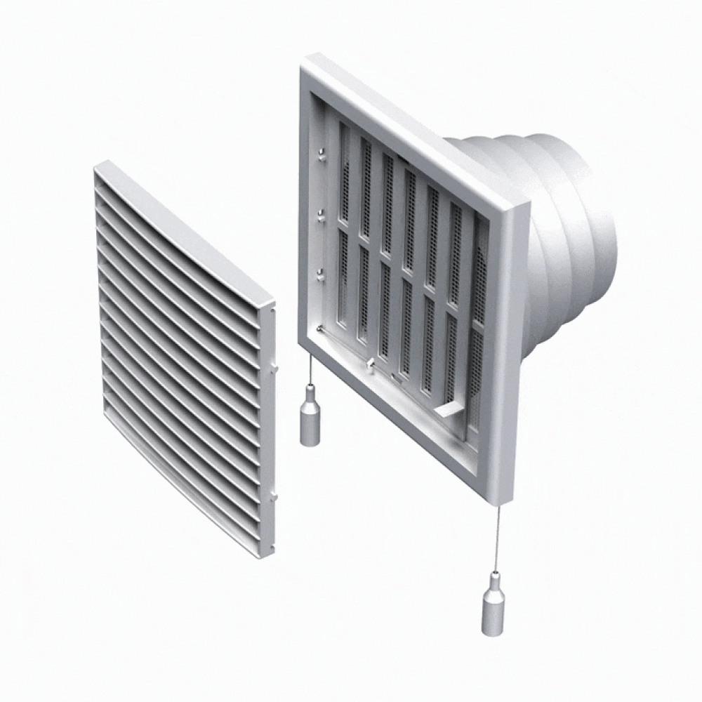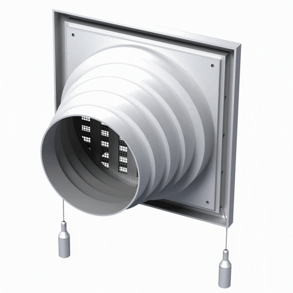 Вентиляційна решітка із заслінкою пластикова МВ 121 ВНРс обладнана регулятором витрати повітря, універсальним патрубком під повітропровід 100 / 110 / 120 / 130 / 150 мм, сіткою від комах і має прямі жалюзі.